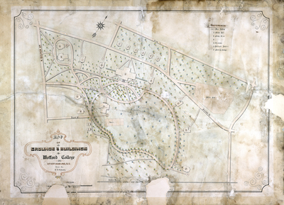 Map of the Wofford campus, drawn in pen and ink by George Clinkscales. Map restored circa 2000.
