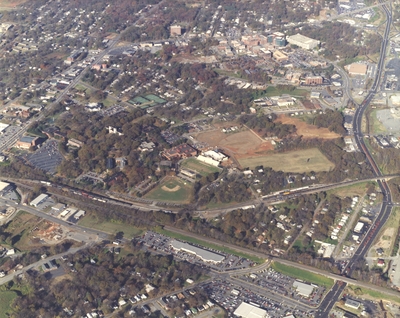 This is an aerial view of the Wofford College campus in November 1994. The Richardson Physical Activities Building and Gibbs Stadium are under construction.