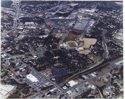 This is an aerial view of the Wofford College campus in November 1994. The Richardson Physical Activities Building and Gibbs Stadium are complete, and the Campus Life Building is still brick-colored.