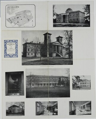 This poster contains photos of several buildings on the Wofford College campus in the 1910s, including Main Building, Whitefoord Smith Library, John B. Cleveland Science Hall, Burnett Gymnasium, and James H. Carlisle Memorial Hall. The poster also shows some interior scenes in Carlisle Hall, a campus map, and a portrait of President Carlisle.
