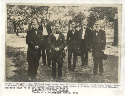 A copy of a stereograph photo of the Wofford faculty in the late 1860s, including Whitefoord Smith, James Carlisle, David Duncan, A. H. Lester, Warren DuPre, and A. M. Shipp.