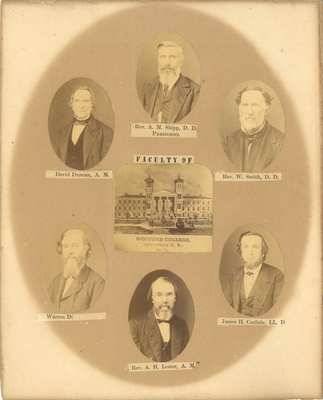 A composite photograph of the Wofford College faculty in 1873, including David Duncan, Albert Shipp, Whitefoord Smith, Warren DuPre, A. H. Lester, and James H. Carlisle