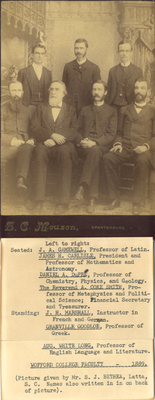 This group photo of the faculty from 1889 includes J. A. Gamewell, James H. Carlisle, Daniel A. DuPre, A. Coke Smith, J. H. Marshall, Granville Goodloe, and A. W. Long. Smith served from 1885-1889, Marshall from 1886-90, Goodloe from 1886-90, and Long from 1888-90.
