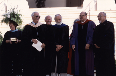 Members of the faculty who retired at Commencement 2001, including Victor Bilanchone, John L. Seitz, John M. Bullard, and W. Scot Morrow.