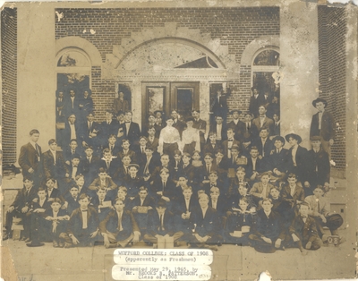 This photograph is of the Wofford College class of 1908, taken apparently during their freshman year, in front of Cleveland Science Hall.