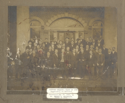 This photograph is of the Wofford College class of 1908, taken during their senior year, in front of Cleveland Science Hall.