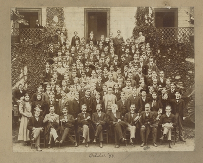 Photo of the Wofford College student body in October 1898 in front of Main Building. The faculty are in the front row, and the first four women students are on the ends of the second row.