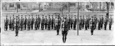 The Wofford Fitting School was a preparatory school operated by Wofford College until 1924. This photo was taken in 1923, when the school was organized along military lines. The houses in the background were on the west side of North Church Street.