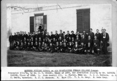 The Wofford Fitting School was a preparatory school operated by Wofford College until 1924. The photo was taken on the old Spartanburg Female College campus, two blocks west of the Wofford campus, in the late 1890s. The Female College campus became the Fitting School campus in the late 1880s.