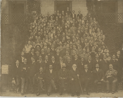 Wofford College student body photograph from October 1900, with faculty in the front row. Photograph taken in front of Main Building. The college's first eight women graduates are on the edges of the lower rows.