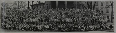 Photograph of the Wofford College student body in front of Main Building on March 12, 1948. The faculty are in the front row, behind students seated on the ground.