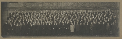 Photograph of the Wofford College student body from 1916. Members of the faculty are standing in the center of the front row.