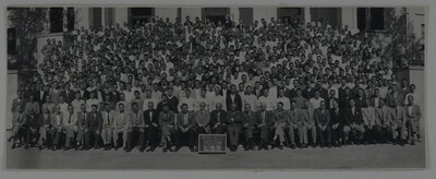 Photograph of the Wofford College student body from October 27, 1955 in front of Main Building. The faculty are in the front row.