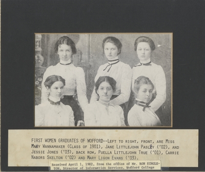 Photograph of the first six women to graduate from Wofford College, including (front row) May Wannamaker '01, Ione Littlejohn Paslay '02, and Jesse Jones '03, and (back row) Puella Littlejohn True '01, Carrie Nabors Skelton '02, and Mary Ligon Evans '03.
