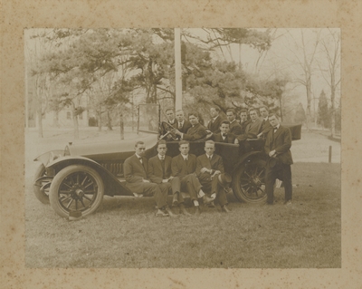 Members of the Wofford College President's Club, photographed on a car, on campus, 1915. Photo also appears in the Bohemian, 1915, p. 181. The President's Club was the group of presidents of various Wofford groups.